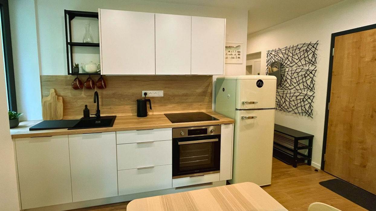 Kuchyňa apartmánu je prakticky zariadená a poskytuje všetko potrebné pre prípravu chutných jedál. Moderné spotrebiče a dostatok pracovného priestoru umožňujú pohodlné varenie. Jej spojenie s obývacou časťou dotvára príjemnú atmosféru otvorenosti. Súčasťou kuchyne je aj jedálenský stôl so sedením pre 4 osoby, ktorý sa dá rozšíriť pridaním lavice až na 6 osôb, čím sa stáva ideálnym miestom na rodinné večere alebo stretnutia s priateľmi. Kuchyňa sa tak stáva miestom, kde sa rodina a priatelia môžu zhromažďovať, zdieľať zážitky a vychutnávať si jedlo v útulnom prostredí.
