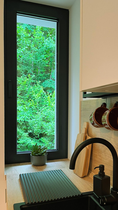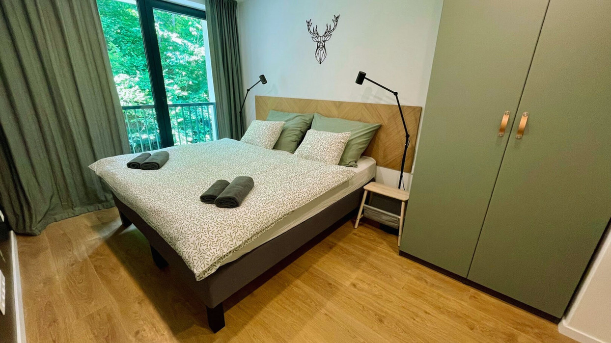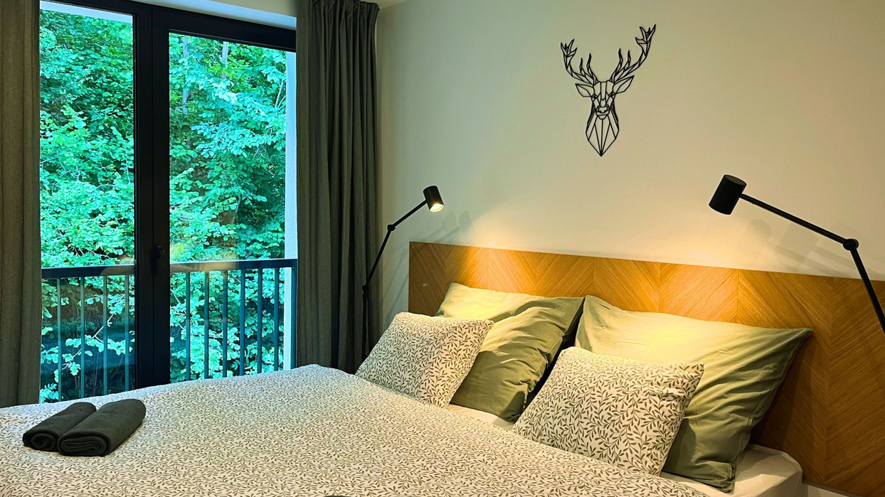 The apartment features two separate bedrooms, ideal for families or groups of friends. Each bedroom is comfortably furnished with high-quality mattresses and soft bedding. The interior creates a cozy atmosphere and offers a view of the forest behind the apartment, ensuring privacy and comfort for all guests.